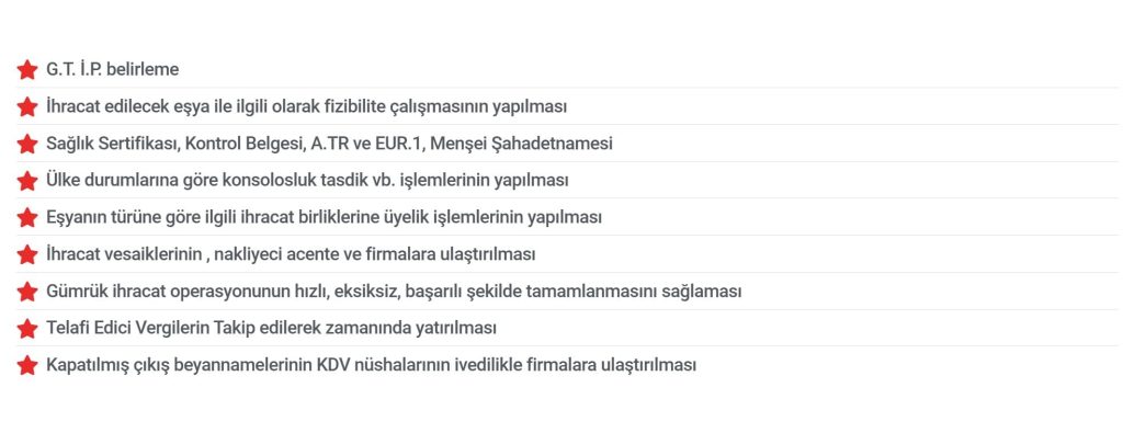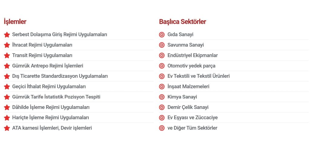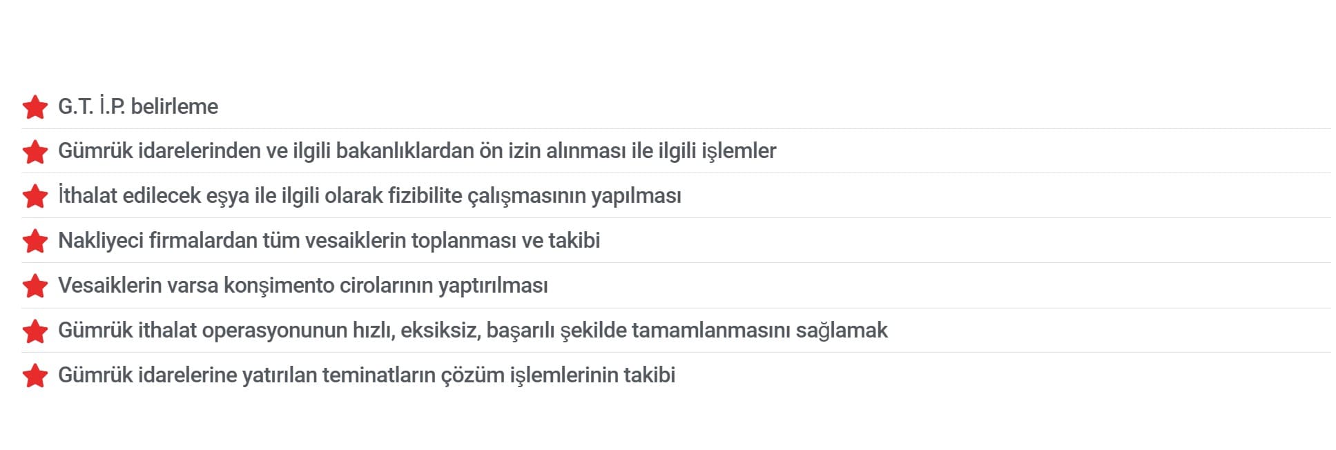 Şirketimiz dış ticaret kapsamında her türlü İthalat, İhracat, Serbest Bölge İşlemleri, Antrepo İşlemleri, Geçici İthalat, Geçici İhracat, Transit, Dahilde İşlem İzinleri vb… uzmanlık gerektiren her türlü gümrükleme hizmeti verebilecek kapasite ve yeterlilikteki kadrosu ile sektörde faaliyet göstermektedir.